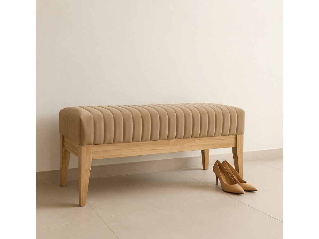 Elegantní čalouněná lavice s jemným vertikálním prošíváním a přírodní dřevěnou konstrukcí. Ideální pro chodby, ložnice nebo obývací pokoje jako praktický i designový prvek.
