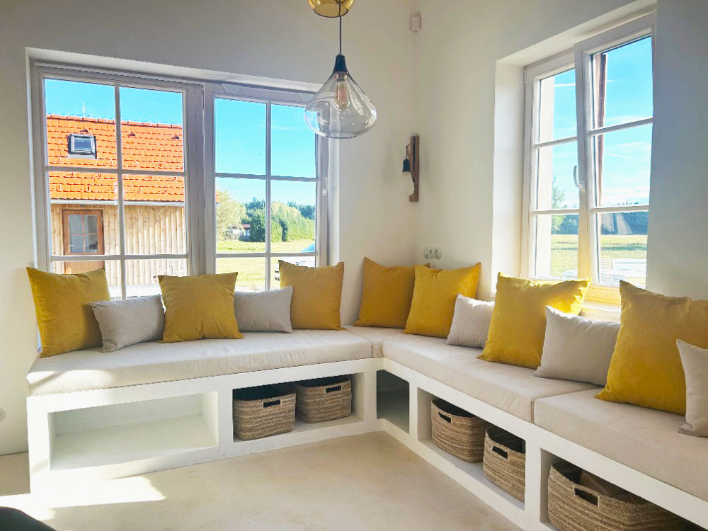 Polstr na míru pro sedací parapet velkoformátového okna v rodinném domě v Praze, který vytváří příjemné místo pro odpočinek s výhledem do zahrady. Použitý interiérový materiál je sladěný s ostatními textilními prvky v interiéru a zajišťuje komfort, příjemný omak i snadnou údržbu. Tato realizace se objevila také v televizním pořadu Rady ptáka Loskutáka ve spolupráci s Pavlínou a Lucií z projektu O domově. Realizace proběhla na míru.