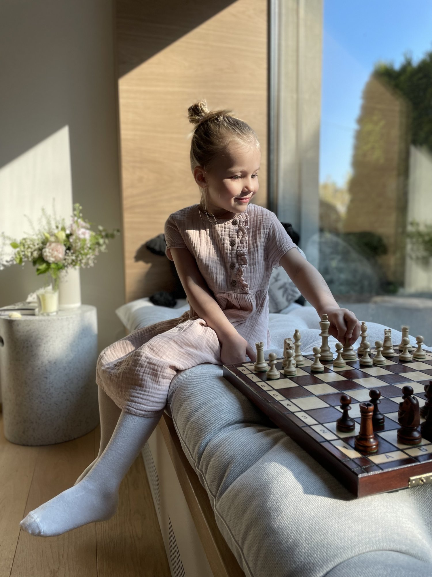 Prošívaný designový polstr s čalouněnými knoflíčky vyrobený na míru pro sedací parapet v kuchyni, která je propojená velkým oknem se zahradou. Řešení vytváří příjemné místo pro odpočinek i každodenní posezení s výhledem ven.