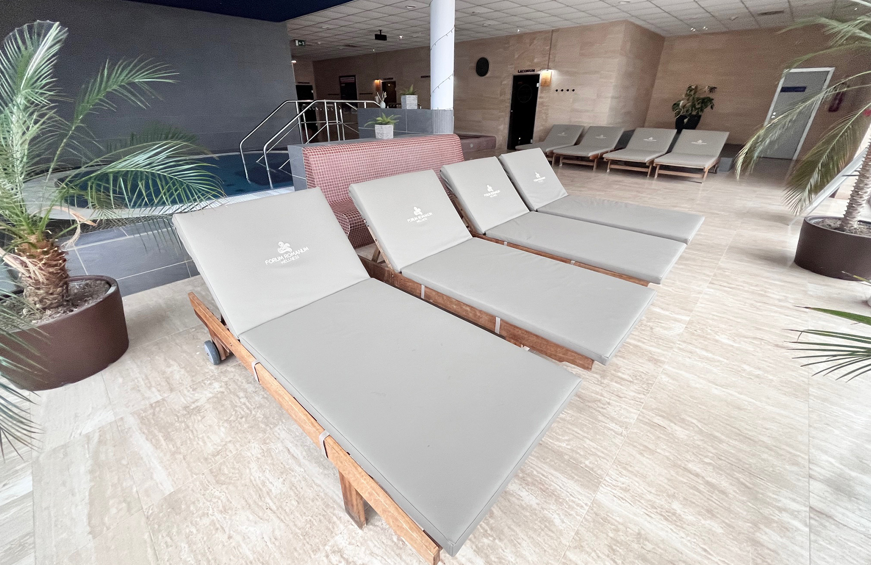 Pro wellness zónu Aqualand Moravia jsme realizovali výrobu polstrů na lehátka na míru, navržených pro dlouhodobý a intenzivní provoz v prostředí odpočinkové zóny. Projekt zahrnoval osobní konzultaci, výběr vhodného materiálu, přesné zaměření přímo na místě i následnou finální instalaci.